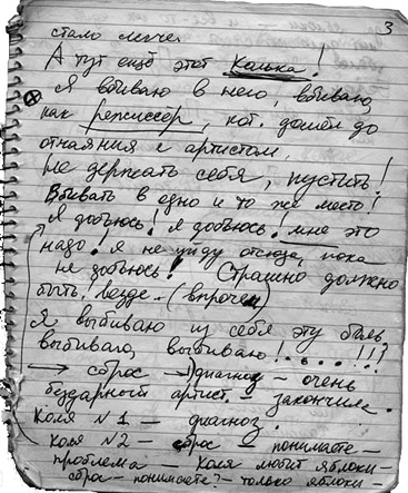 И у меня есть ощущение – я бегу от этой смерти. И тогда у меня ощущение, что я здесь, и он здесь, и сейчас выйдет Колька и будет, сейчас, играть на скрипке, и когда он заиграет тогда Мармеладов встанет, выйдет из той комнаты – и ничего этого не было. Закрыть все произошедшее в эти два дня. Вот у нее мысль, какая. В романе есть это, но это и в постановке от Гинкаса. Поэтому я его трясу (Кольку), я его гада, вот сейчас: "Вытрясу из тебя мозги все", - потому что если он сейчас вот прочтет, как мы с ним репетировали, то тогда все повернется! И опять будет счастье, и опять все вернется, и опять я буду стирать эти носки и чулки, мы будем ругаться. Все повернется, и он будет живой и не надо будет вот это все опять проходить. Поэтому я беру их в себя, чтобы они вошли в меня. Я имею в виду зрителей. Т.е. душевно я их в себя втягиваю, чтобы мне стало легче, чтобы прикрыть эту боль, - они мне нужны. Я ими питаюсь, я их беру на восприятие. И вот этот Колька. Я вбиваю в него, вбиваю, как режиссер, который дошел до отчаяния с артистами. Поэтому Гинкас просил: "Не держи себя, пусти. Вбивать в одно и то же место: "Ты сейчас будешь! Нет, ты сейчас будешь! Нет, ты у меня будешь рассказывать!" Т.е. не разыгрывая разные вариации, а вот "бить в одно место"! Чтобы что-то получилось в жизни надо бить в одно место. Так вот и К.И. Причем не бояться монотонности интонации, не бояться, что это в одну точку. И я эту точку должна пробить! Эту точку, конкретную эту точку! И сын мой – это та самая точка, которую я все время бью. Вот я за него цепляюсь, потому что когда! он зачитает! или затанцует, вот тогда все повернется. И поэтому в финале, когда он делает па ногой, все тогда – счастье. Значит тогда все, я освобождаюсь, я добилась, пробила эту стену. Я добьюсь, я добьюсь – мне это надо. Страшно должно быть от этого. От этой повторяемости, исступленности. Мне стать страшно и всем. Выбиваю из себя эту боль, выбиваю. И вот когда дошла до края своего – сброс. Сброс – это значит в актерском лексиконе: отпустило все, вышла на ноль. И тогда – диагноз: "Вы знаете, очень бездарный артист". Текст у Достоевского: "Очень несносный ребенок", а мой подтекст – очень бездарный артист. Я бы сделала свое дело, но он – никак. Закончила. Я пишу: "Диагноз № 1".