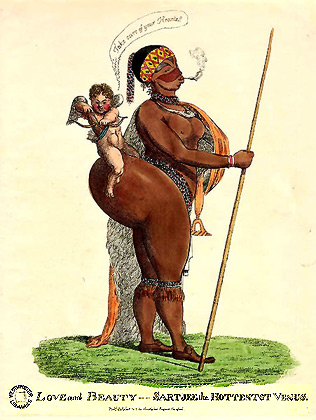 В мае 1810-го года Южно-Африканский фермер и английский солдат прибыли в Лондон с необычным заморским товаром: женщиной по имени Сарчи Бартман, происходящей от народа Хойсан в Южной Африке. Колонизаторам Хойсан были известны под именем Хоттентот. Отличительной чертой Бартман, с точки зрения европейцев, был предельный случай стеатопигии – медицинского состояния, часто наблюдаемого у женщин Хойсан. Оно выражалось в преувеличенной задней части тела. Лондон того времени переживал увлечение паноптикумом (чем более экзотичен урод, тем лучше) и анатомия Бартман была гарантией ее славы. Прозванная «Венерой Хоттентот», именем, которое обозначало противоречивость ее образа в глазах публики как одновременно эротичной, гротескной и чарующе незнакомой женщины, – она стала предметом чрезвычайного интереса в лондонской интермедии. Здесь зрители за плату в два шиллинга рассматривали Венеру Хоттентот на миниатюрной сцене, а также получали шанс быть приглашенными на сцену, чтобы собственноручно убедиться в неподдельности особенностей ее тела.